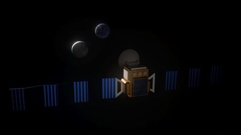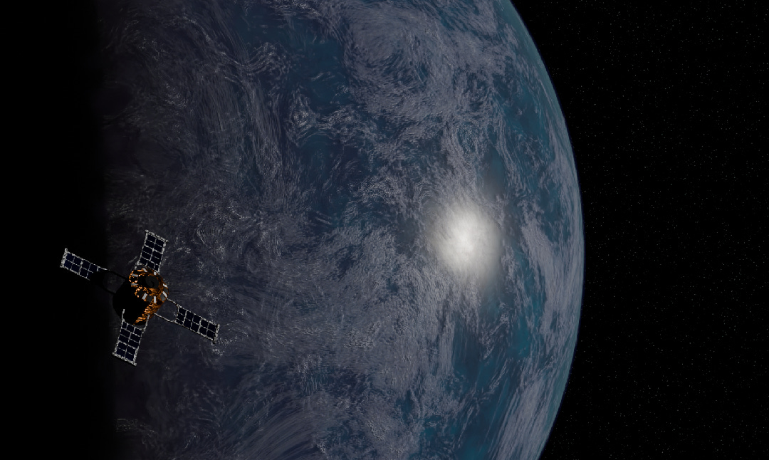 Tournesol flies away from the world which built it, already thousands of kilometers away, and turns around to image the Earth, Moon, and Laika. Normally Laika would be completely invisible at this distance. With the massive outgassing event, enough light is reflected to be visible, if only just.